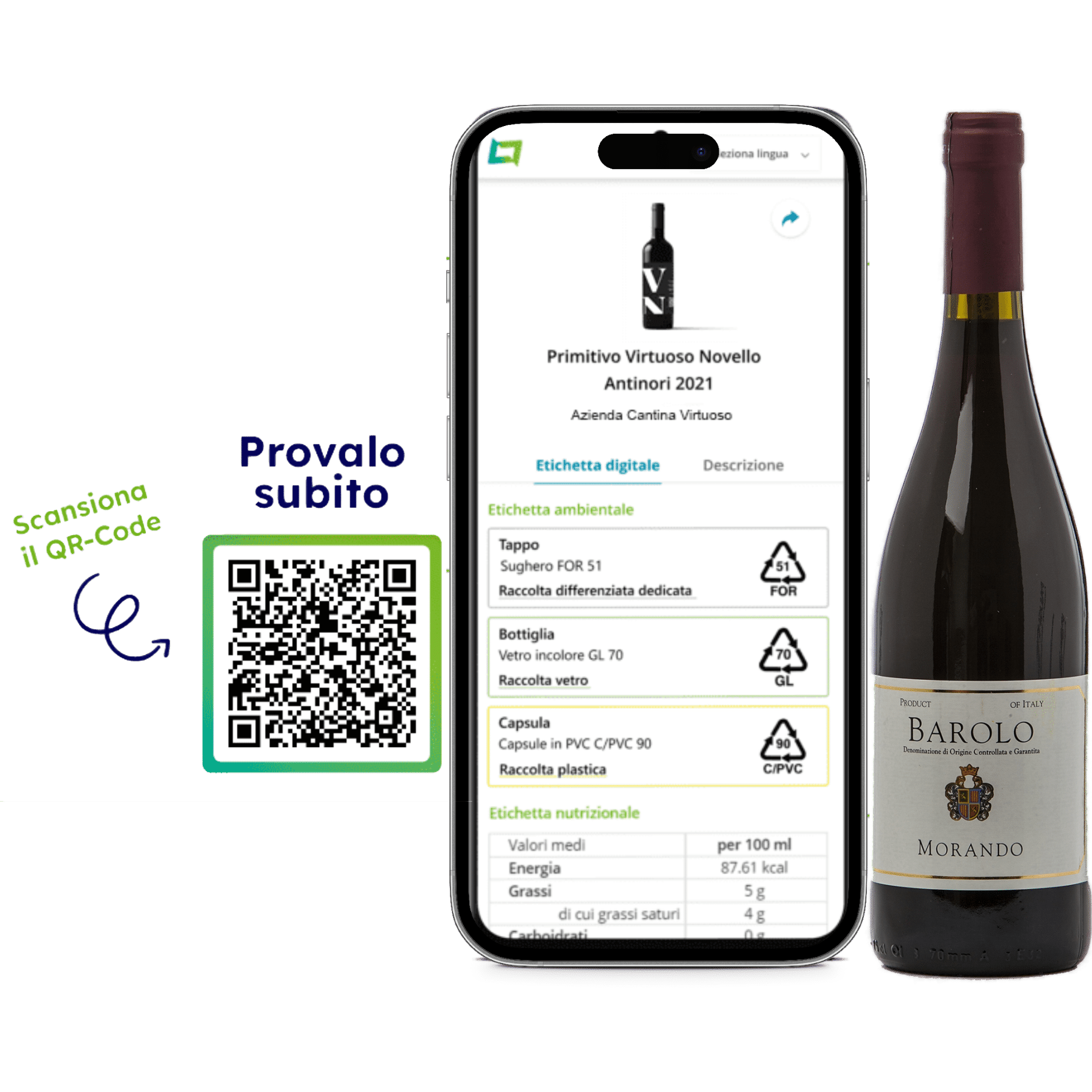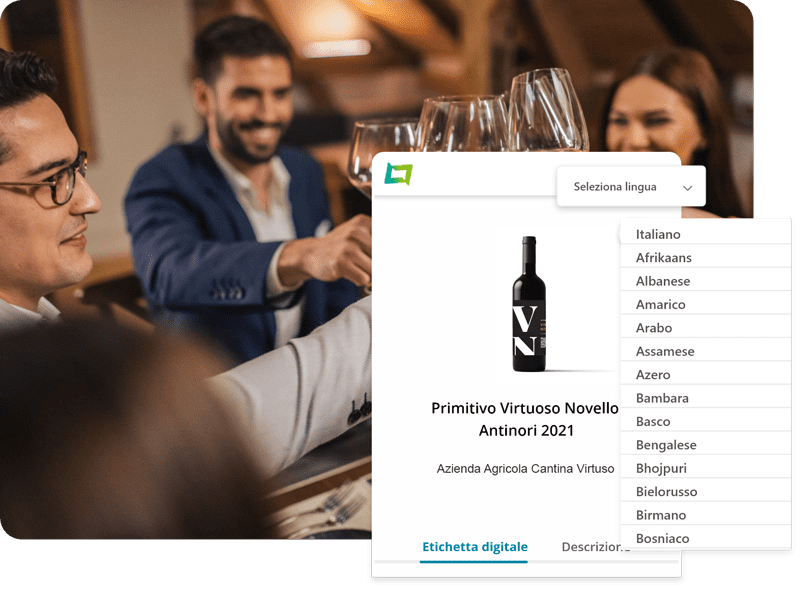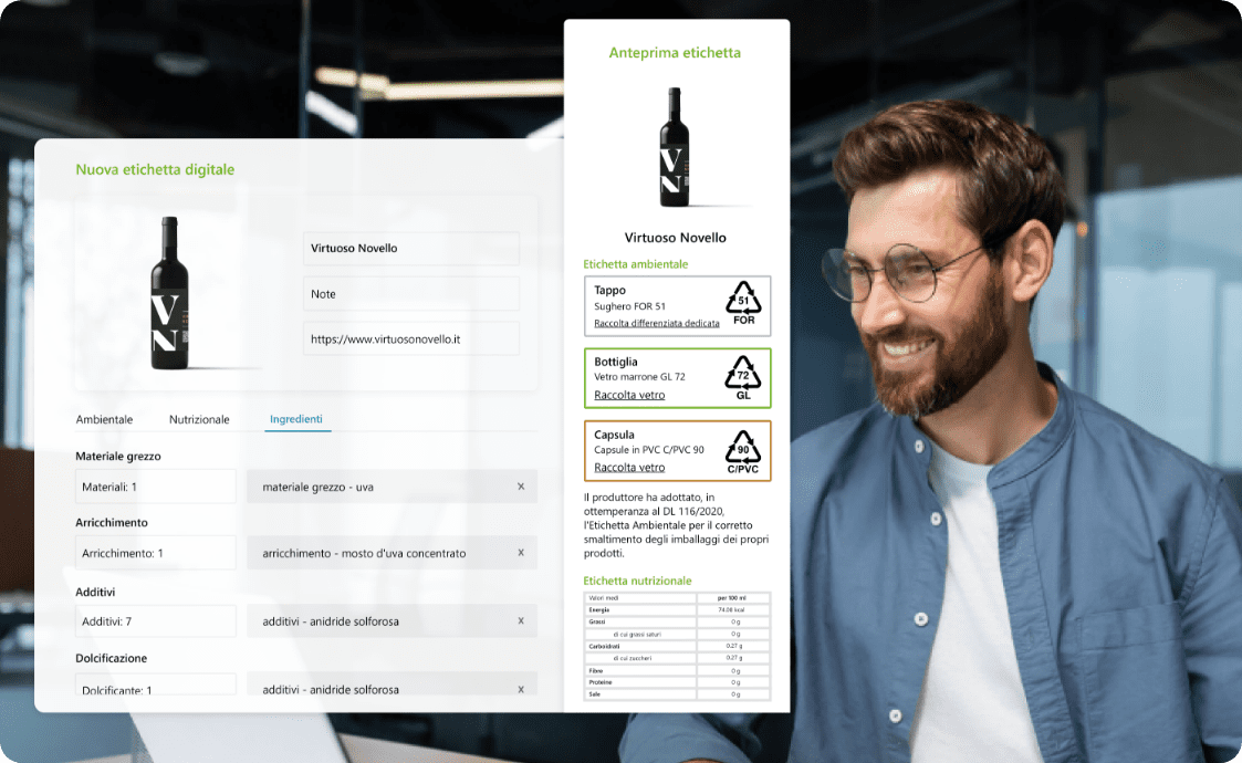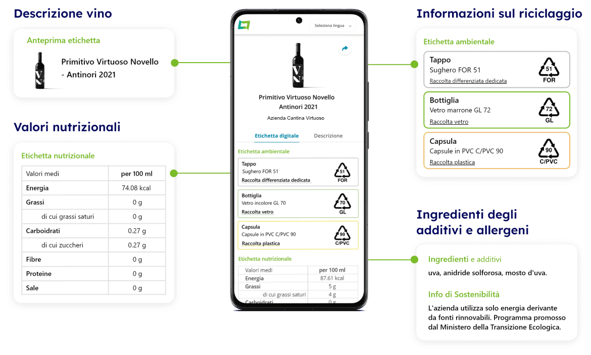 Il cliente finale, utilizzando la scansione del QR-Code posizionato sulla bottiglia, accede in tempo reale all’etichetta digitale del vino, che include informazioni ambientali, nutrizionali e l’elenco completo degli ingredienti.